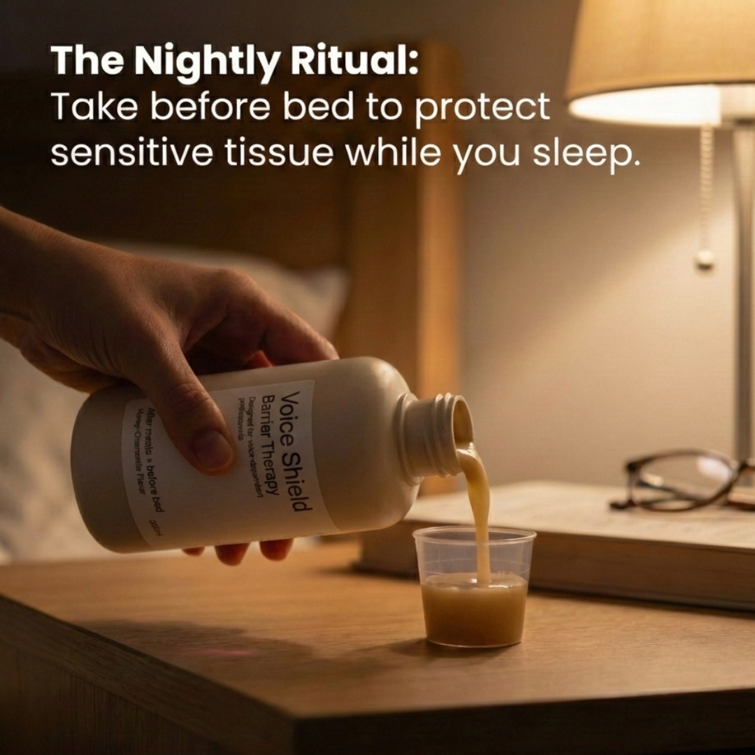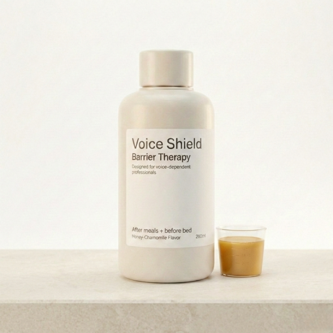 Voice Shield is a liquid dietary supplement designed to support a temporary physical barrier after meals and before bed. It’s made for people who rely on their voice and want added protection during high-risk times.